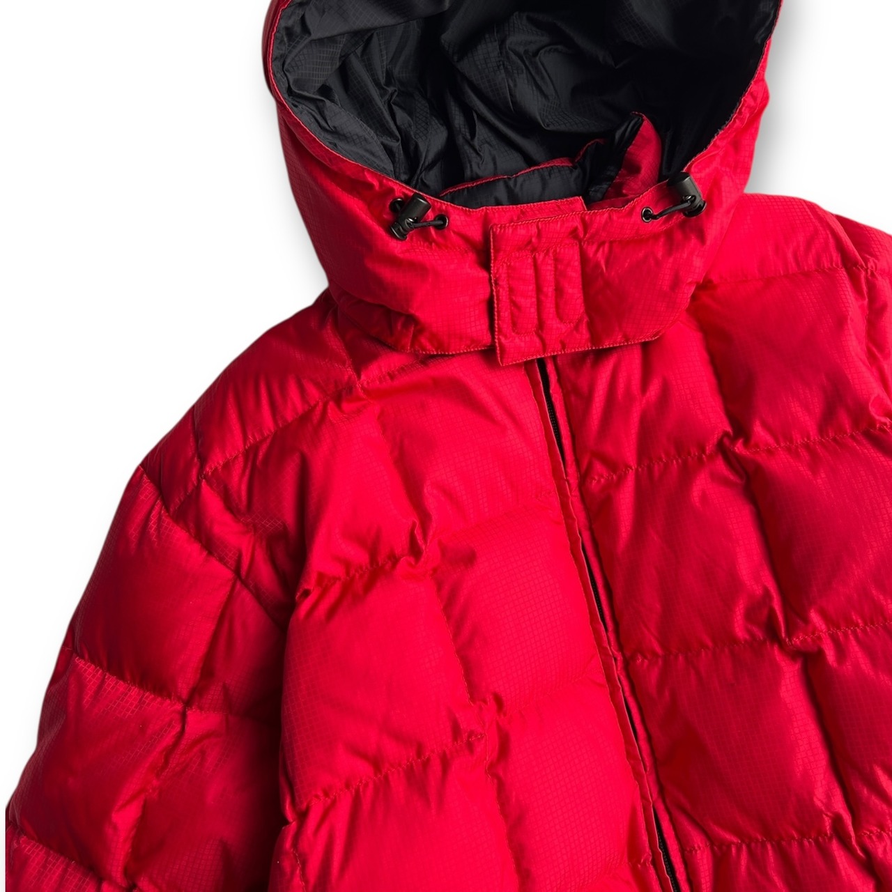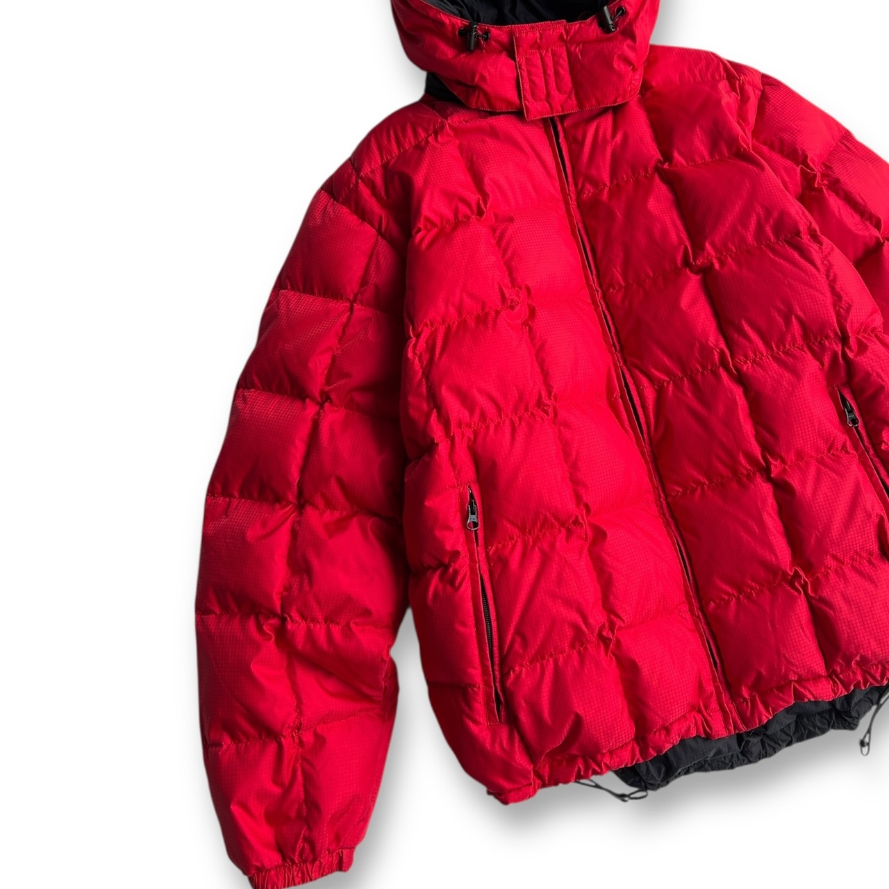 あまり見かけないスクエアキルティングが特徴的なリバーシブルダウン。表面はビビッドなレッド、裏面はブラックの2WAY仕様。