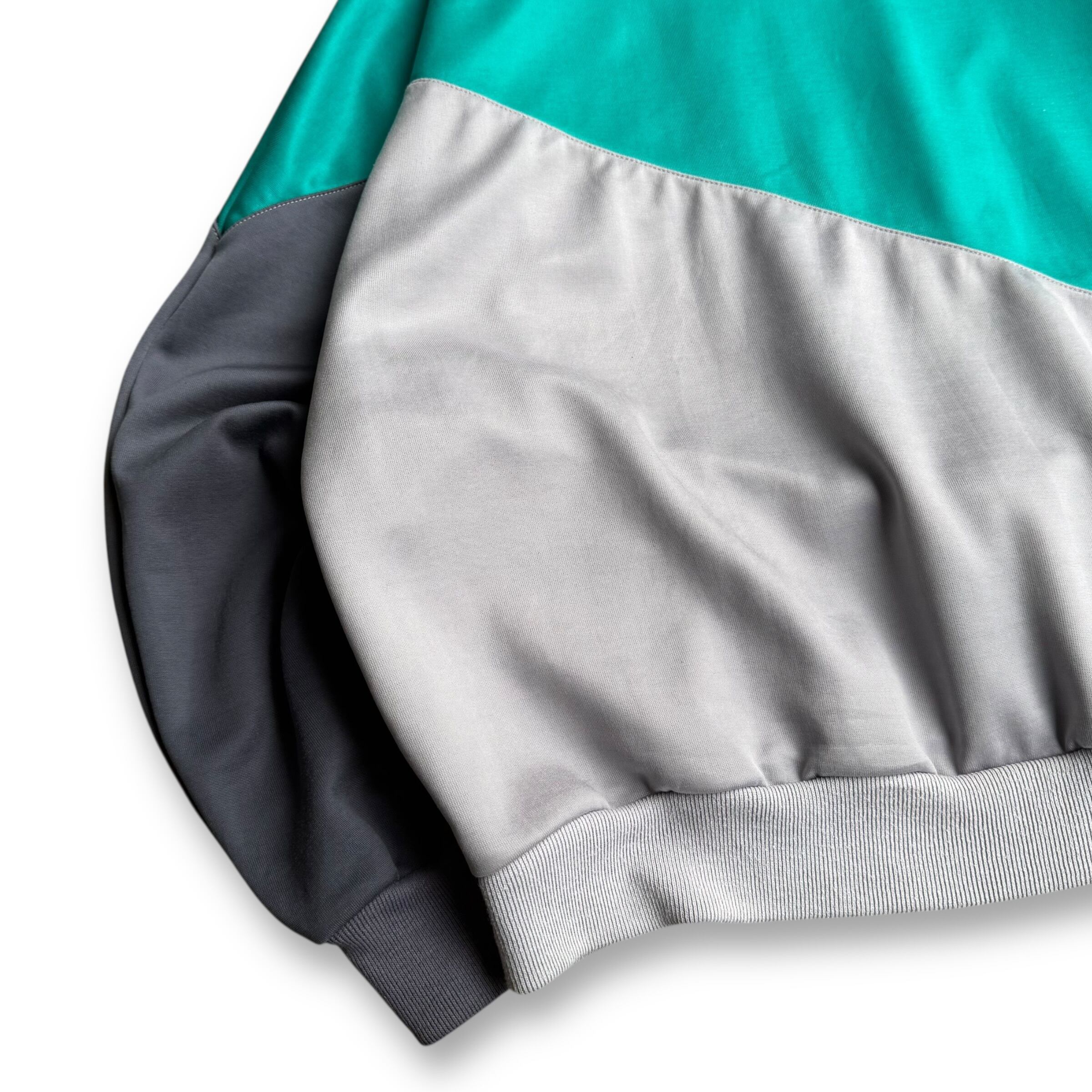 ターコイズグリーンをベースに、グレーとチャコールの切り替えが入ったインパクトのあるカラーリング。胸元には三角形のパネルに NIKE ロゴが入る特徴的なデザインです。