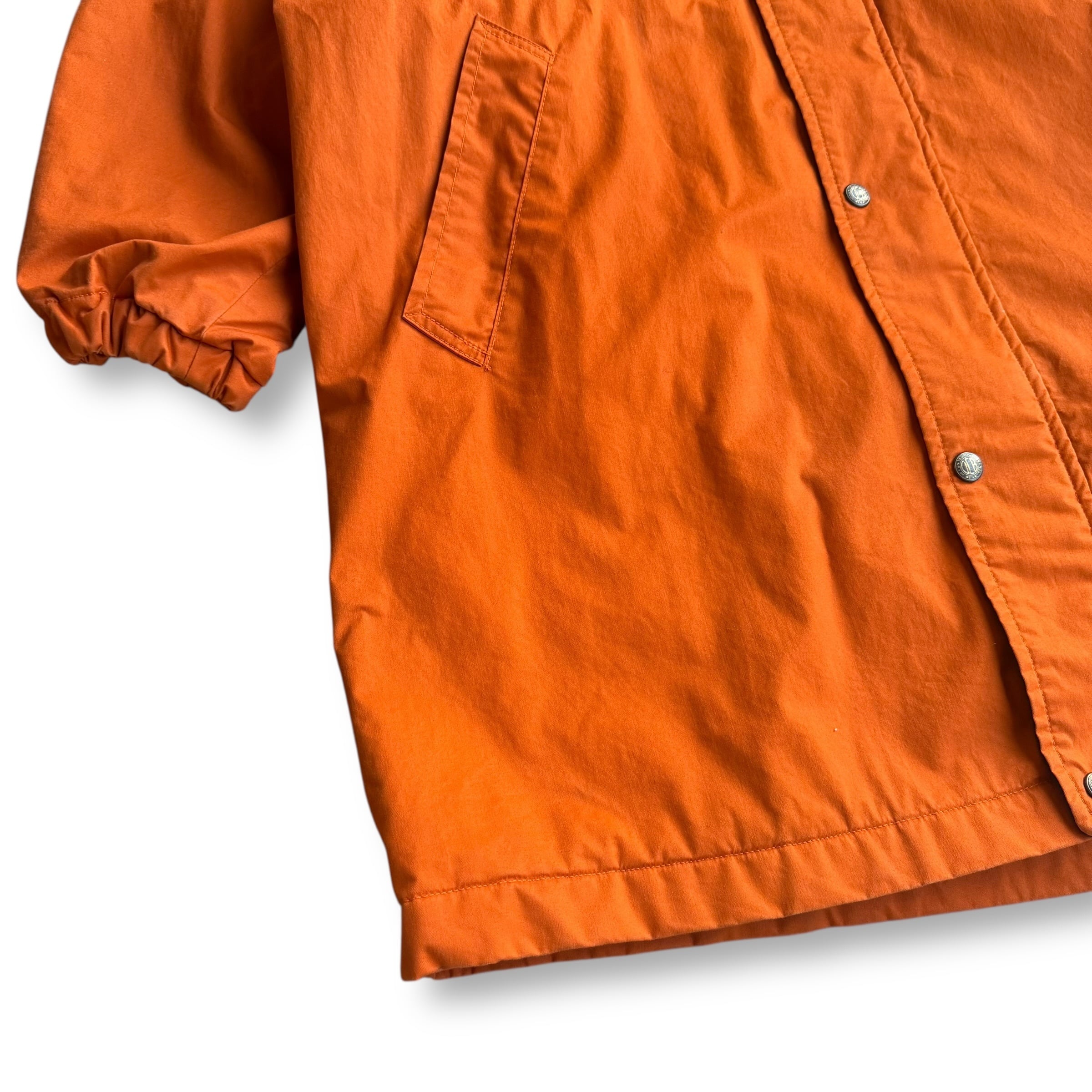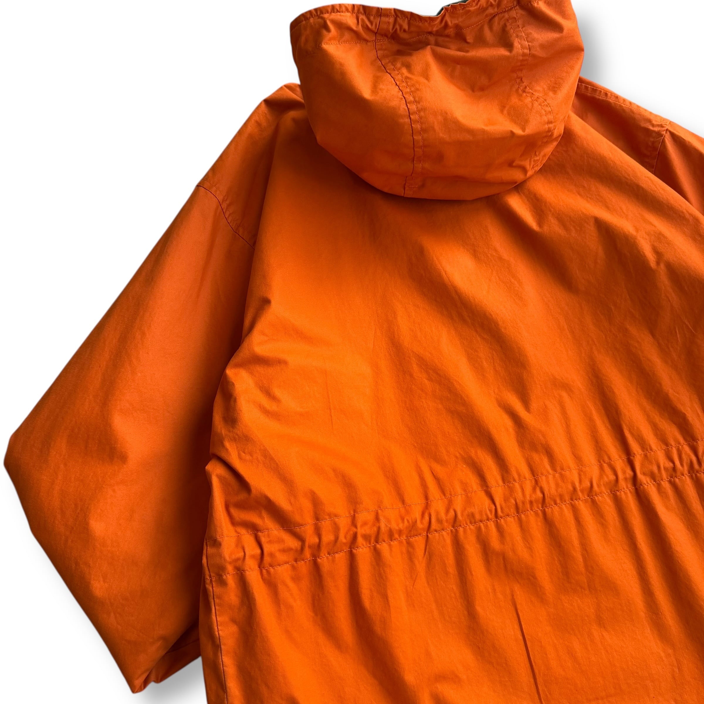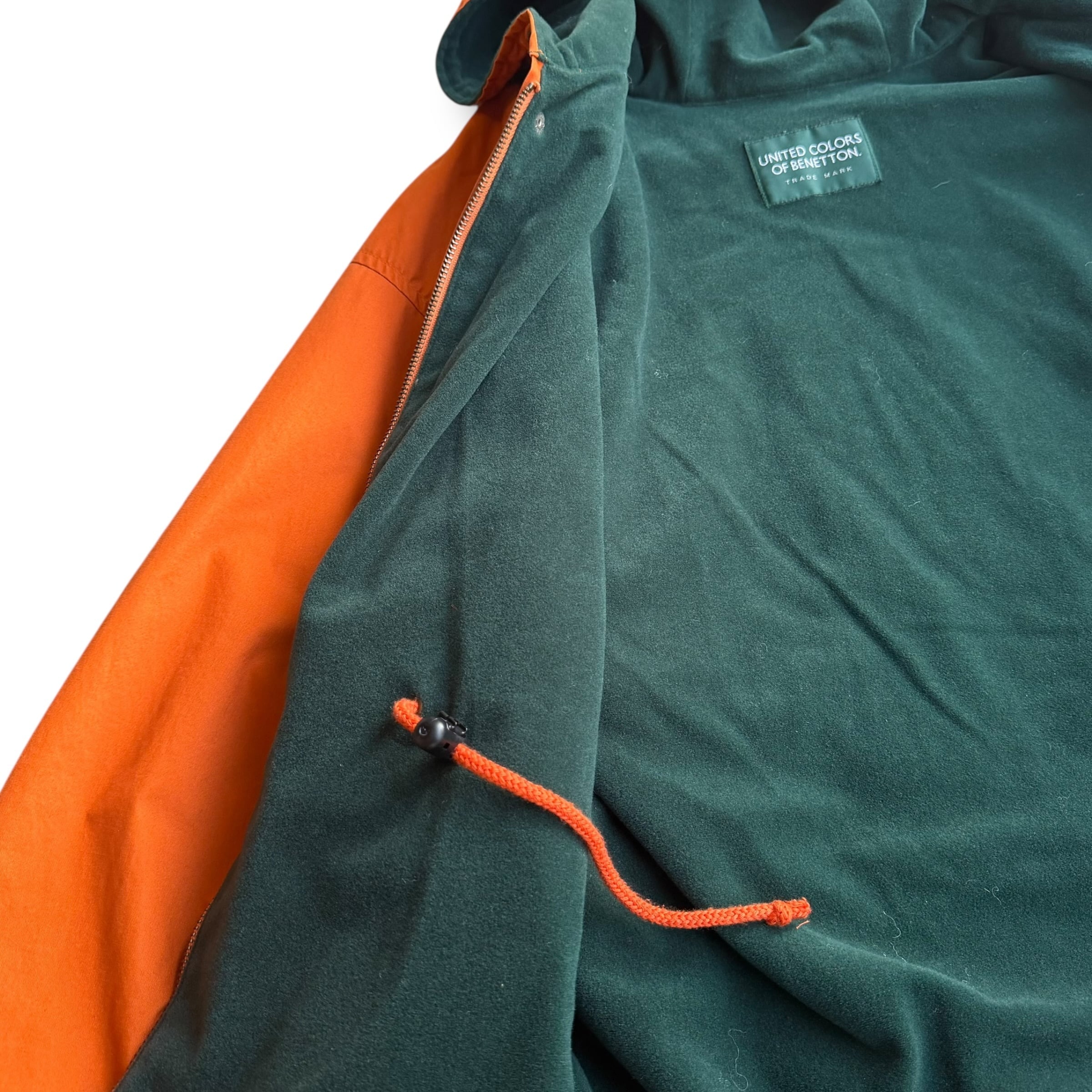 UNITED COLORS OF BENETTONのフードコート。鮮やかなオレンジのシェルに、ダークグリーンのフリースライナーを合わせた配色が印象的な一着。